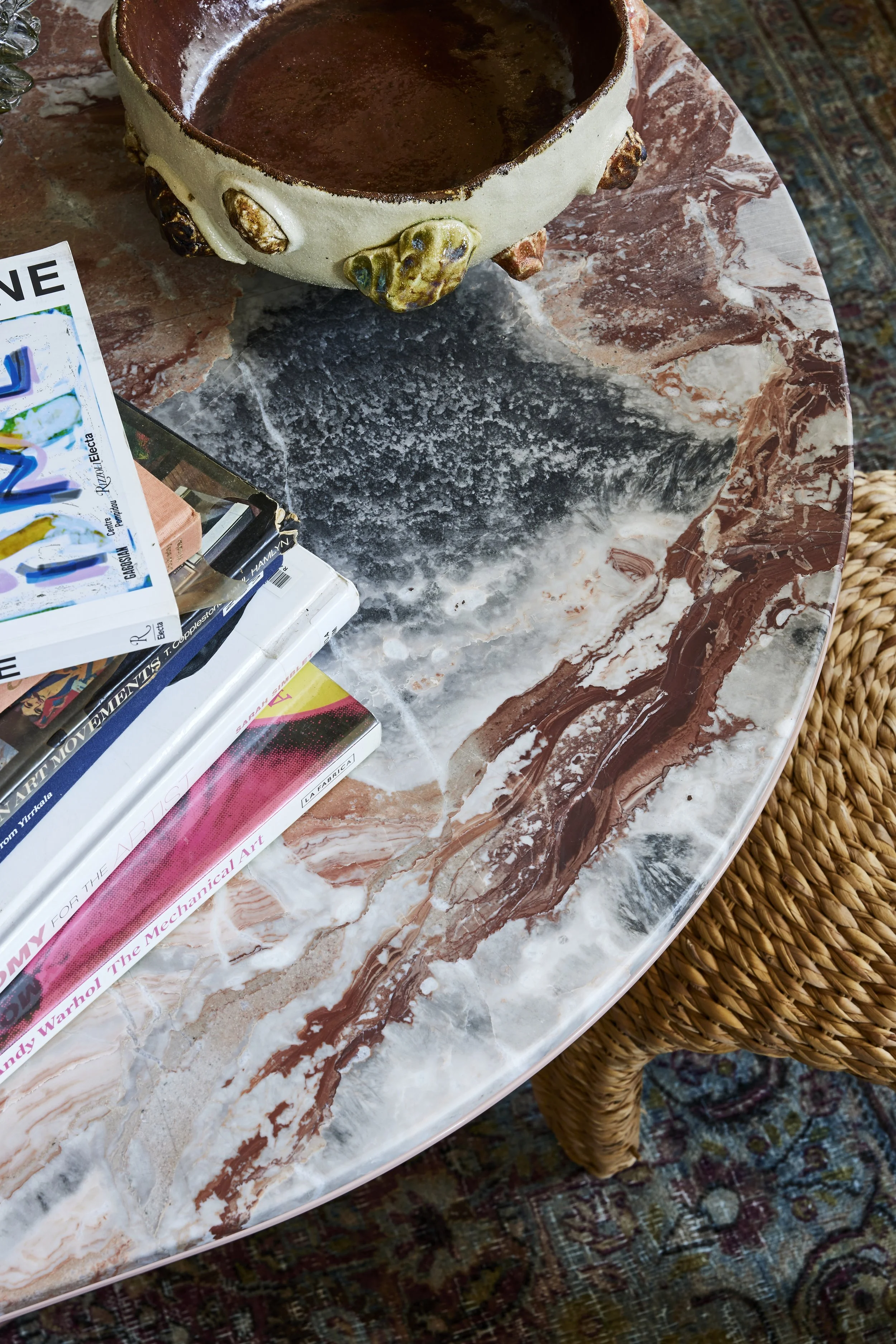 Committed to minimising material waste, Studio Noakes designed custom bespoke pieces within the apartment, including a custom timber veneer sideboard and also the incredible Rosso Orobico marble dining table—the off-cuts and remainder of the marble was repurposed to create a vanity in the powder room.
