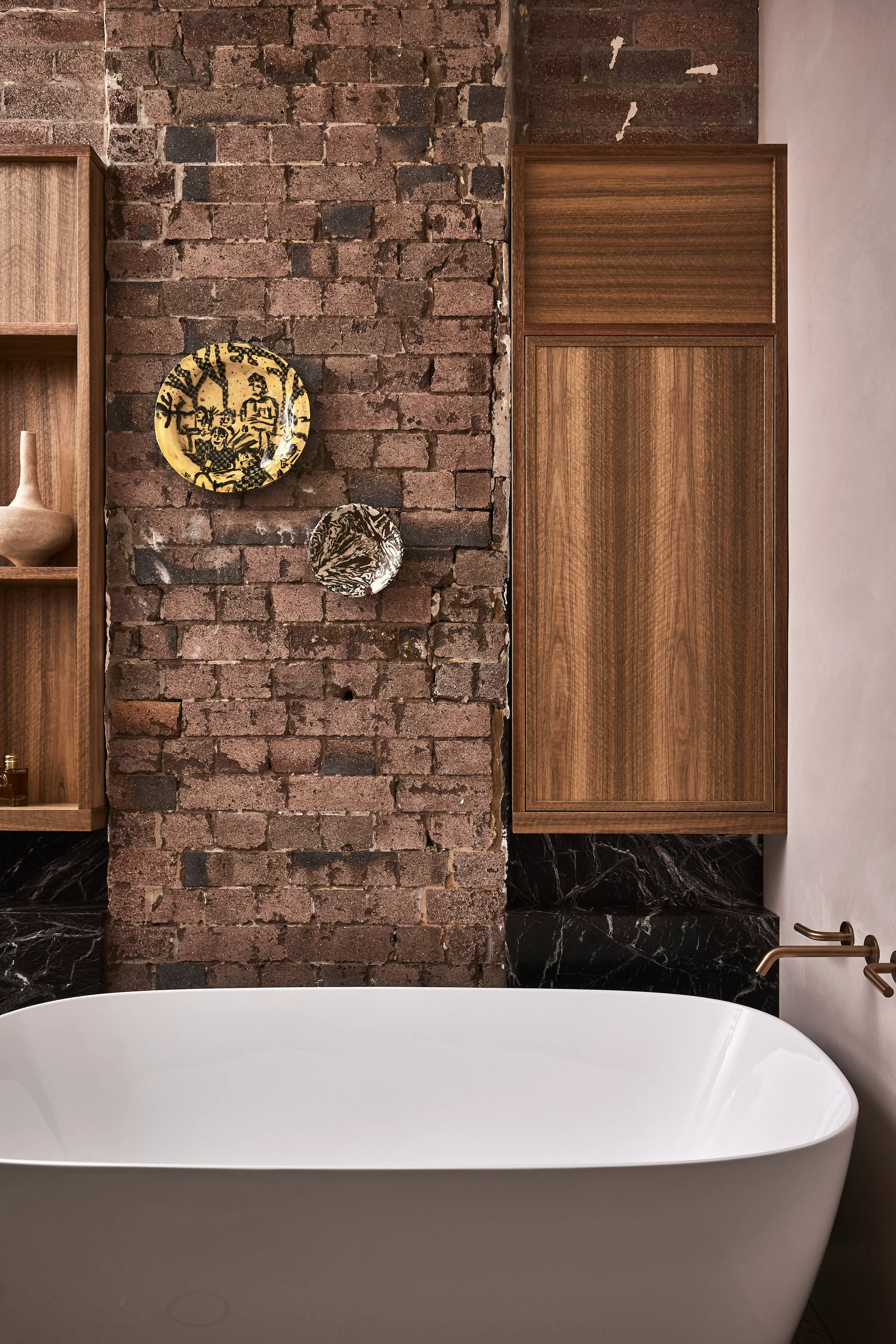 Spotted gum veneer joinery in the bathroom adds warmth and texture.