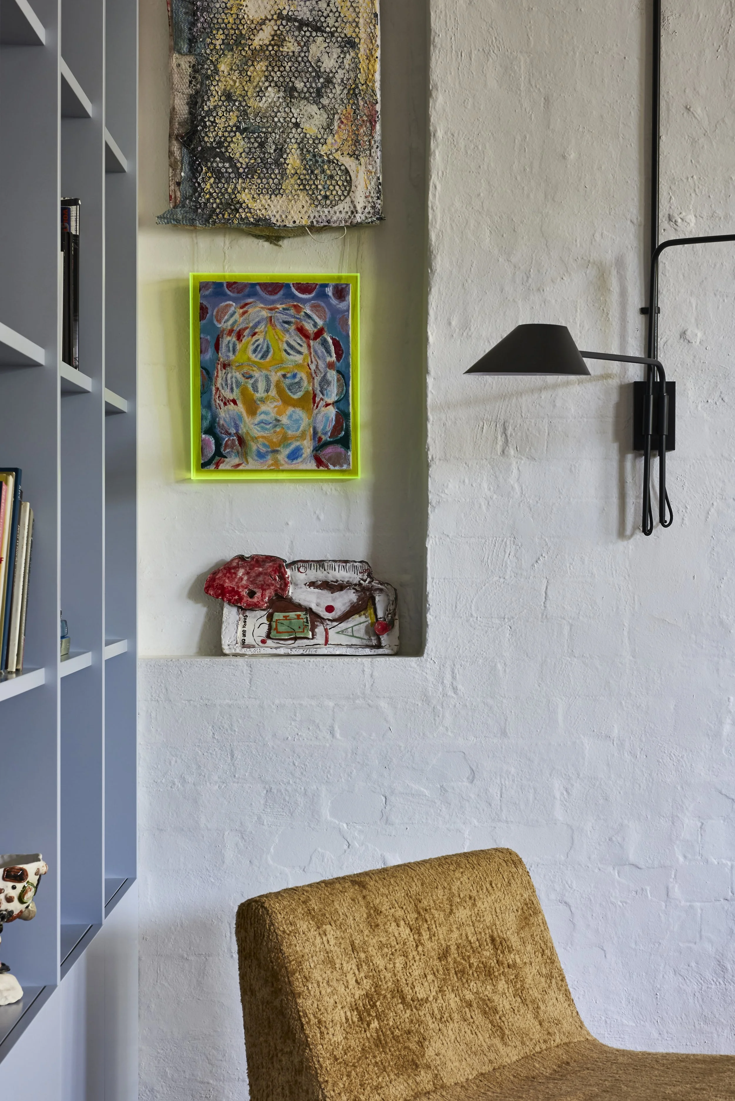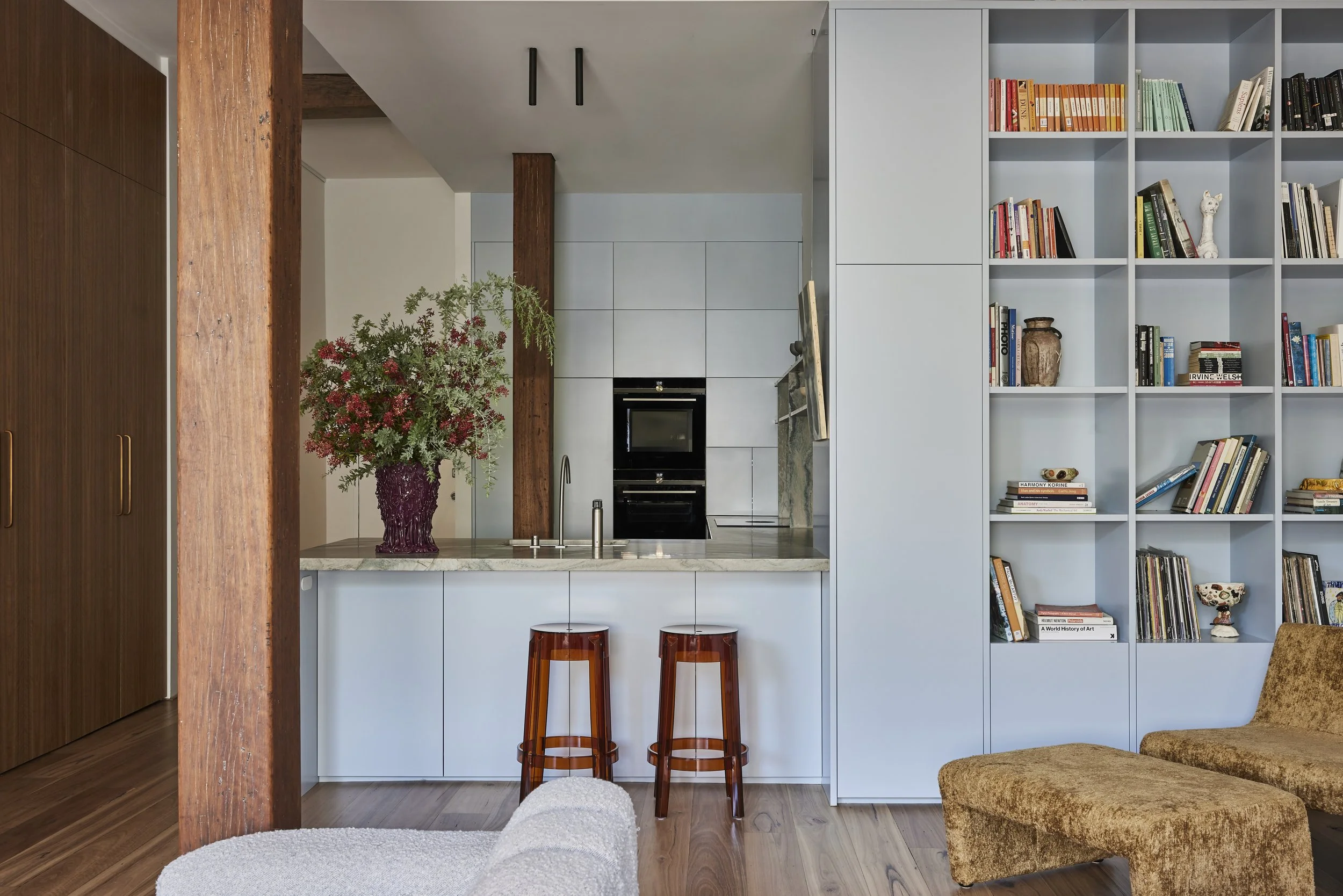 Thoughout the apartment, original features have been sympathetically retained, including soaring high ceilings, and robust hardwood columns and rafters. The new design serves as a textural and dynamic backdrop for showcasing the client’s dynamic art collection, featuring paintings and ceramics from emerging and more established local artists.