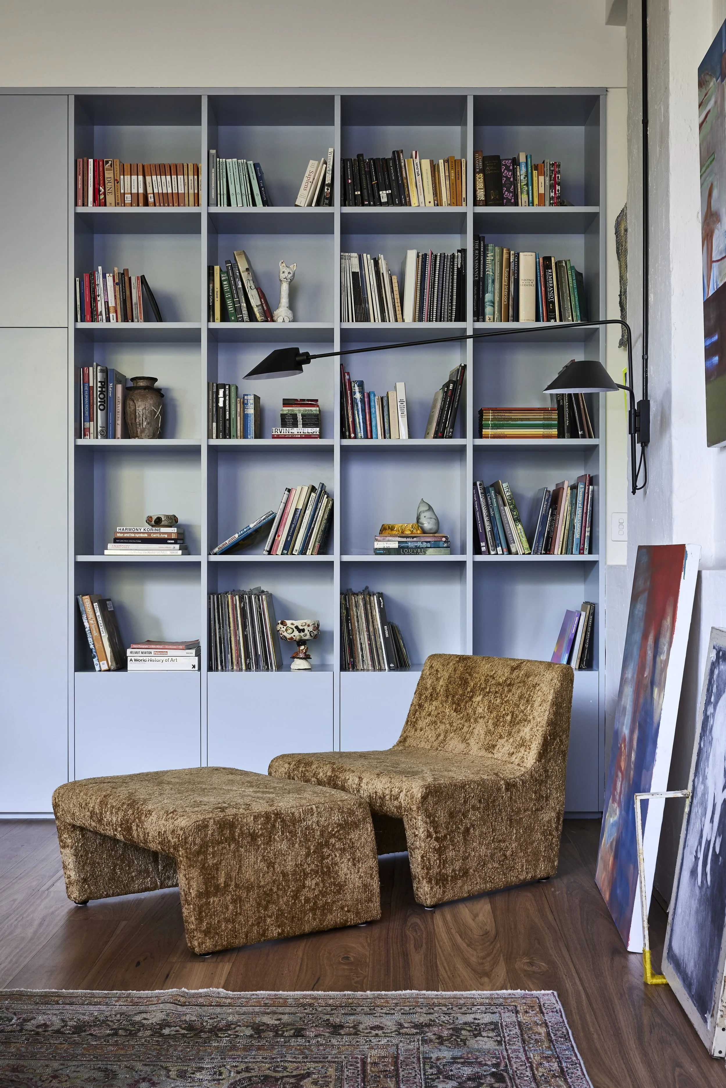 The interior palette for the joyfully eclectic coloured and layered apartment came from the aforementioned art collection, the many large and small scale original artworks hung throughout the spaces dictated the tones applied throughout. The kitchen cabinetry is painted in Dulux Oxford Half, which is muted yet also adds a striking focus in the open plan living and kitchen space.