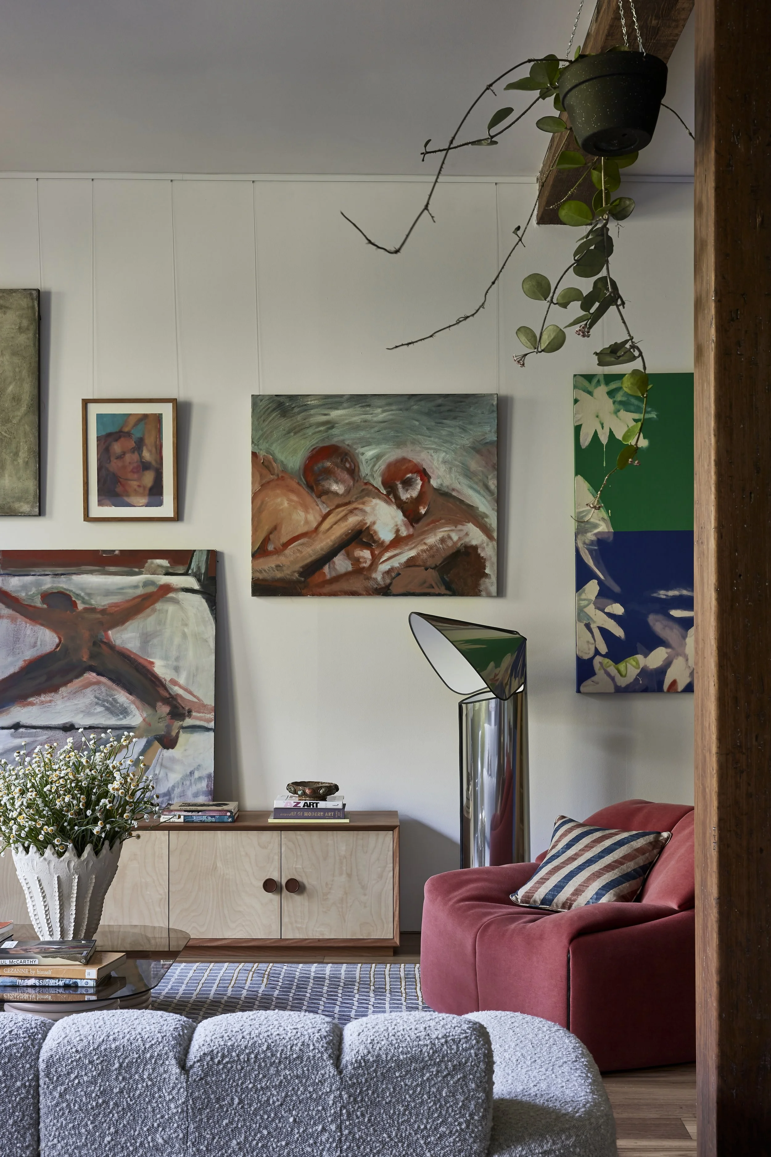 Timber veneer sideboard custom designed by Studio Noakes. Artwork by Madison Scott and Luca Blasonato.