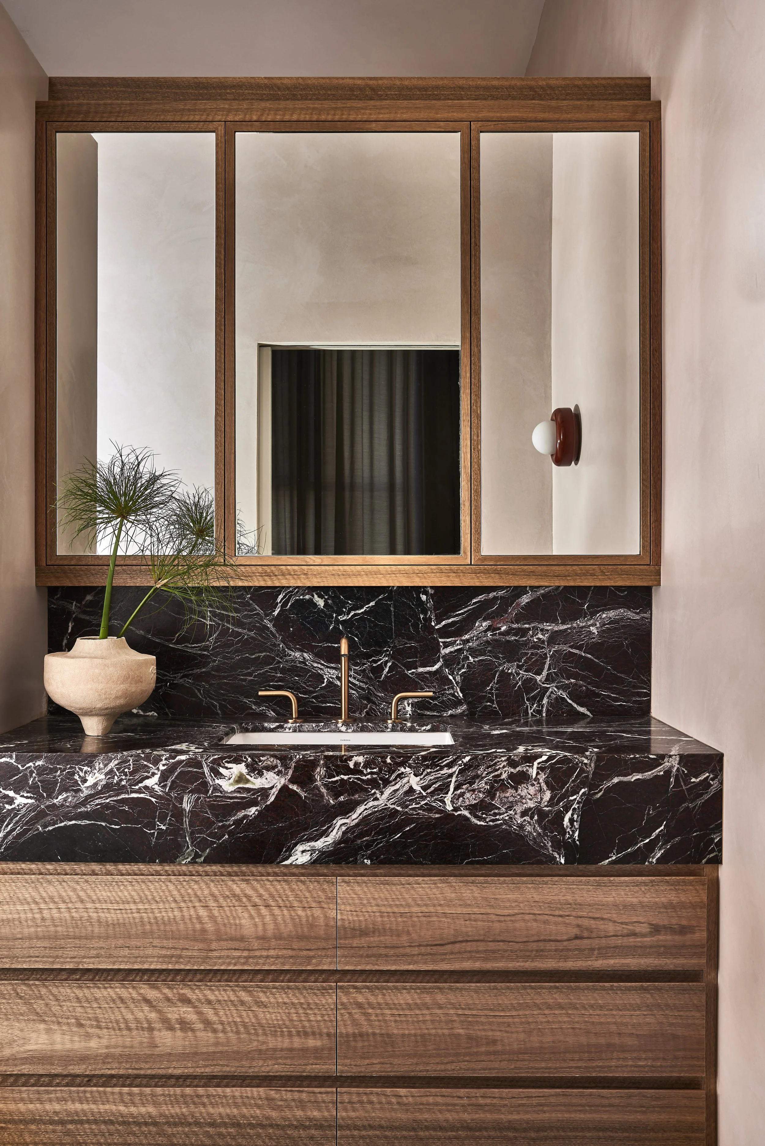 Bathroom mirror by Gebrüder Thonet Vienna. Rosso Orobico Levanto marble was repurposed from the off-cuts of the custom dining table.