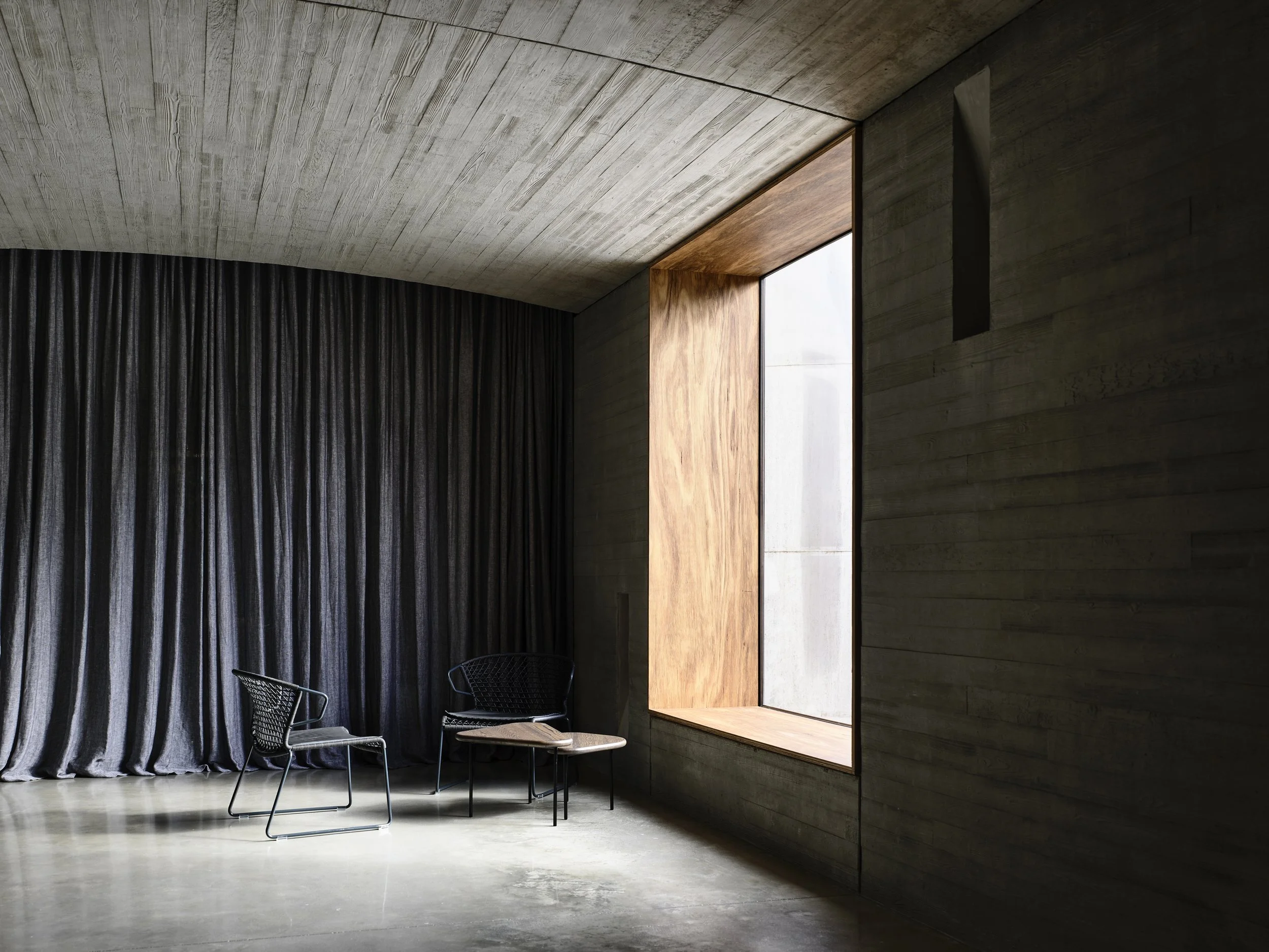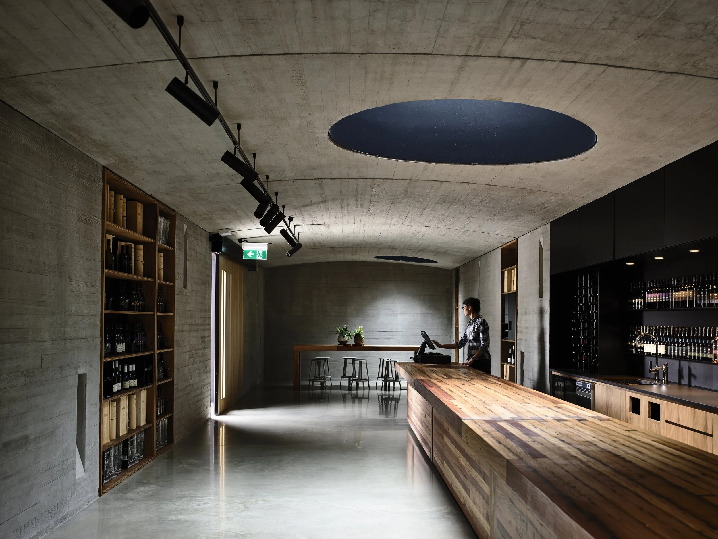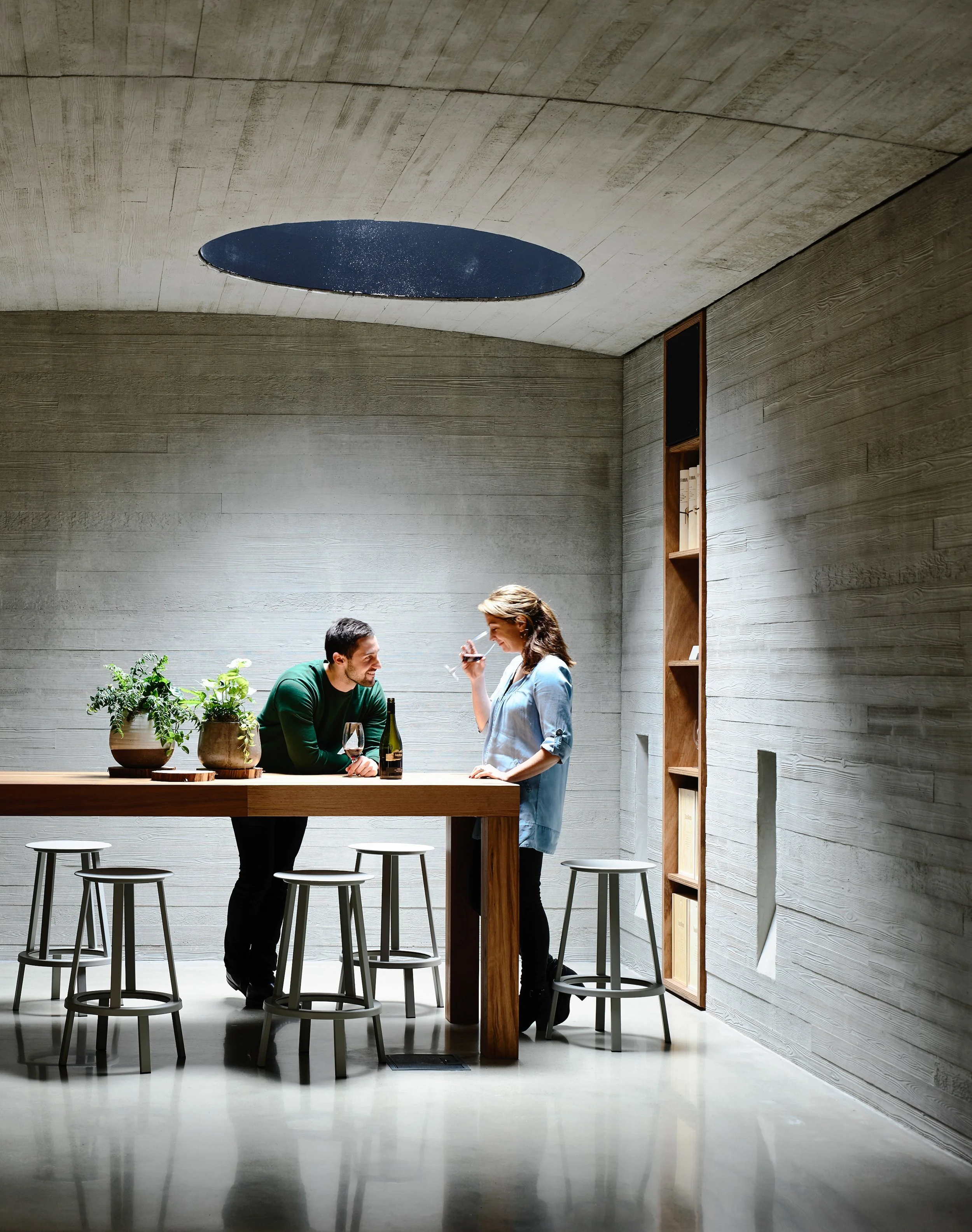 Entering via the large timber door, through the circular stone forecourt that provides vistas out towards the Yarra Valley, takes you under the ground, where the choice of materials by Kerstin Thompson Architects amplifies the colour, taste, and smell of the wines. The architects settled on a palette of textured concrete with timber highlights and furniture from recycled timber for the subterranean wine bar. With circle skylights punching through, the result is a warm and inviting ambience through the colder months and a refreshing break in summer.