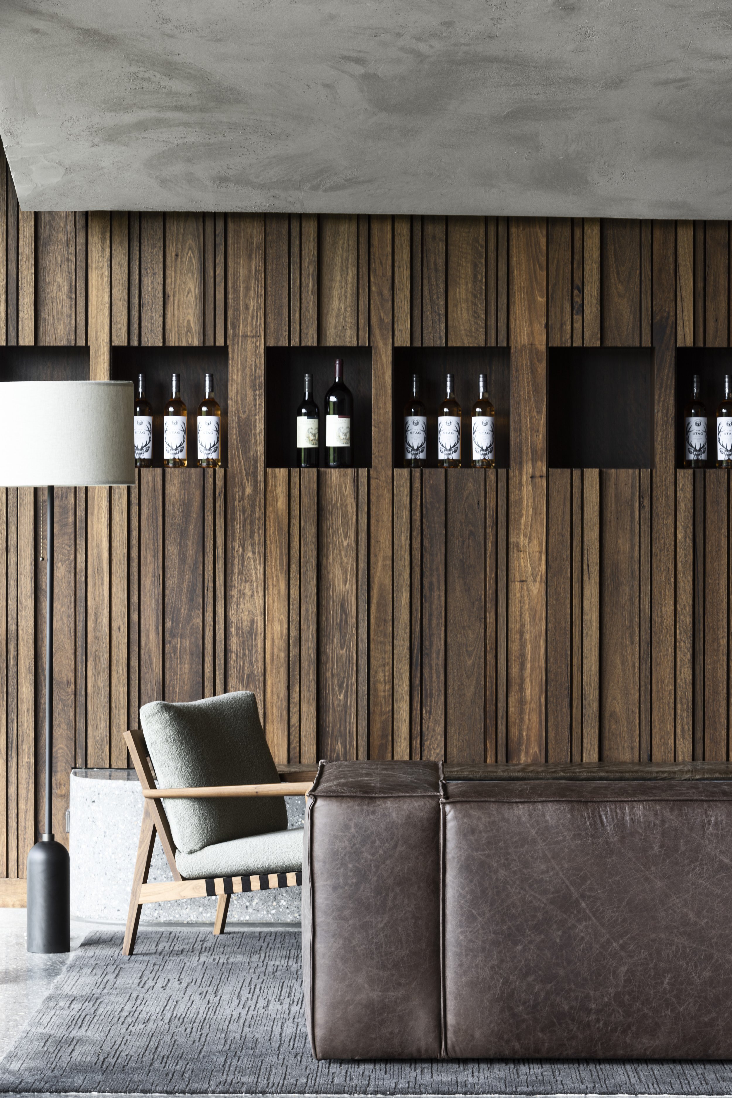 St Hubert’s is the best example of this engagement with the landscape and heritage, all within a modern interpretation — authenticity is at the heart of the design. A large copper door sets the scene through two high concrete walls within the monolithic earth building. Inside, Cera Stribley continues the earthy materiality with concrete and copper, timber panelling, smooth natural-edged timber wine tasting benches and brown leather seated stools.
