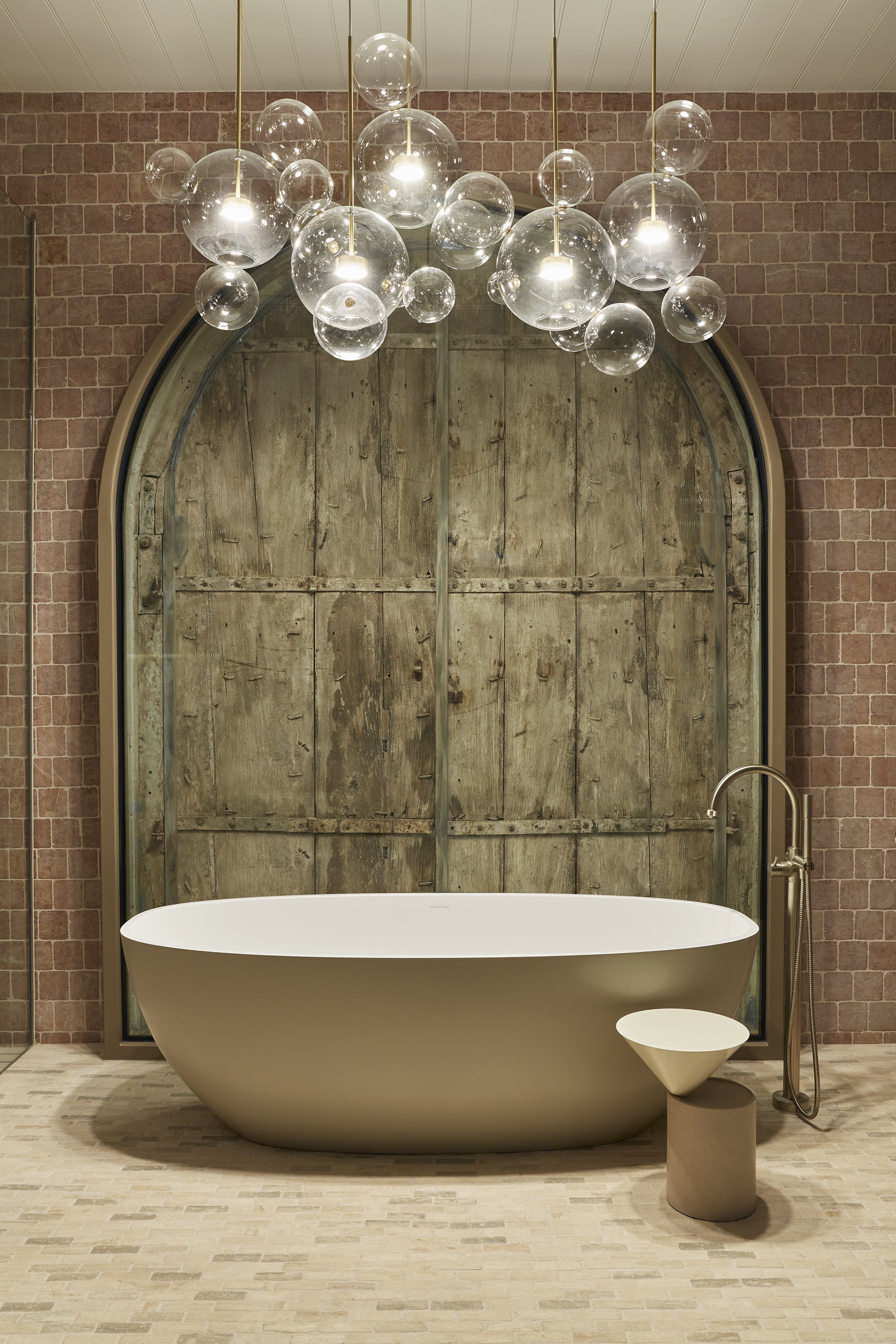 “Enoki nicknamed one of their private suites ‘Sparkling Suite’ after one of their best-selling bottles. Designed to feel light and airy, the room is crisp and ebullient, and even incorporates fizz-inspired glass pendant bauble lights over the bath.”
