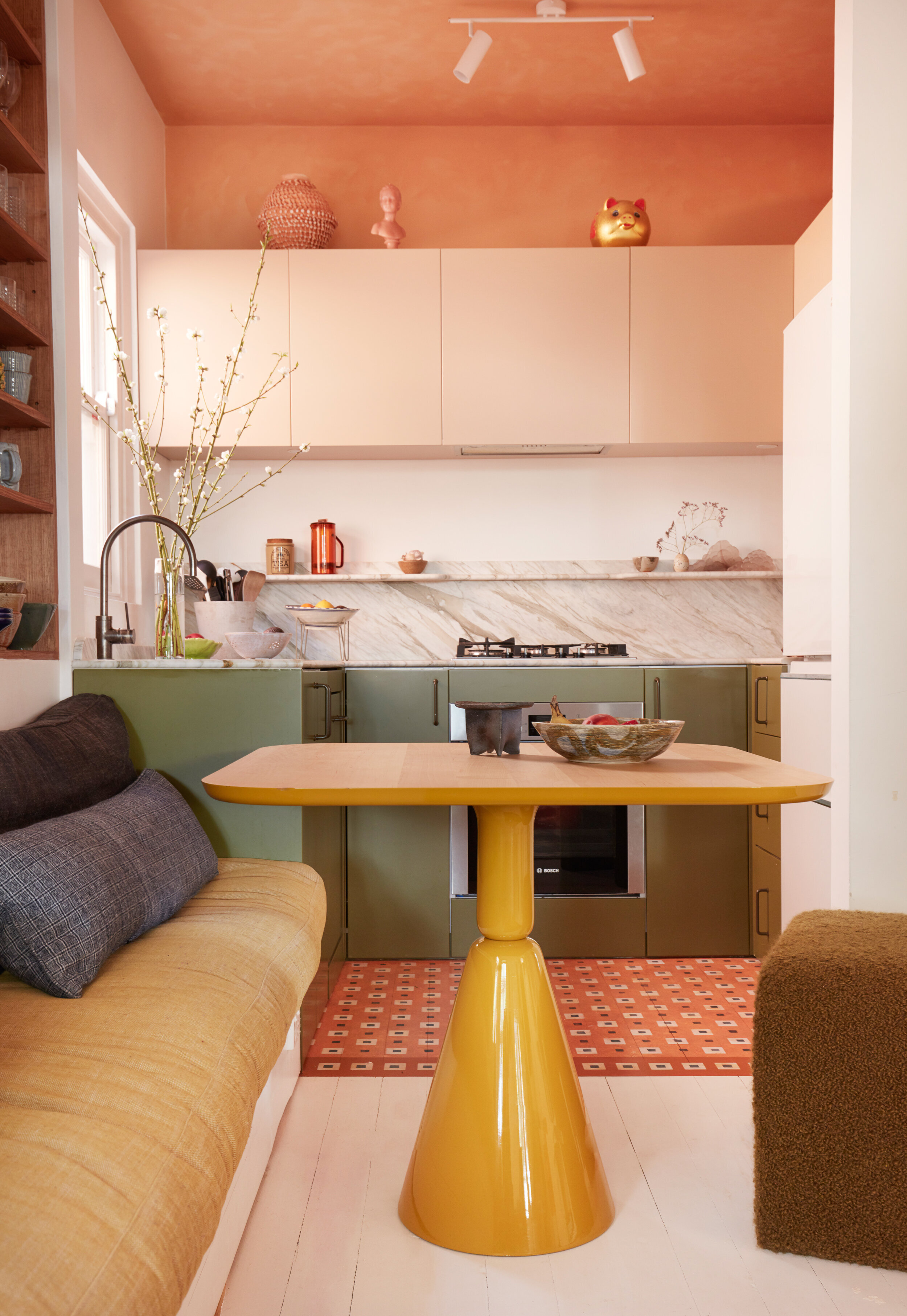 ‘The [kitchen’s] peach-toned ceiling makes it soar to infinity, and it needed this breathing space as it is a tight envelope with a lot jammed into it, but somehow doesn’t feel that way. Using the darker olive shade for the below-counter joinery anchors it.’ Photo: Prue Ruscoe. Styling: Felicity Ng
