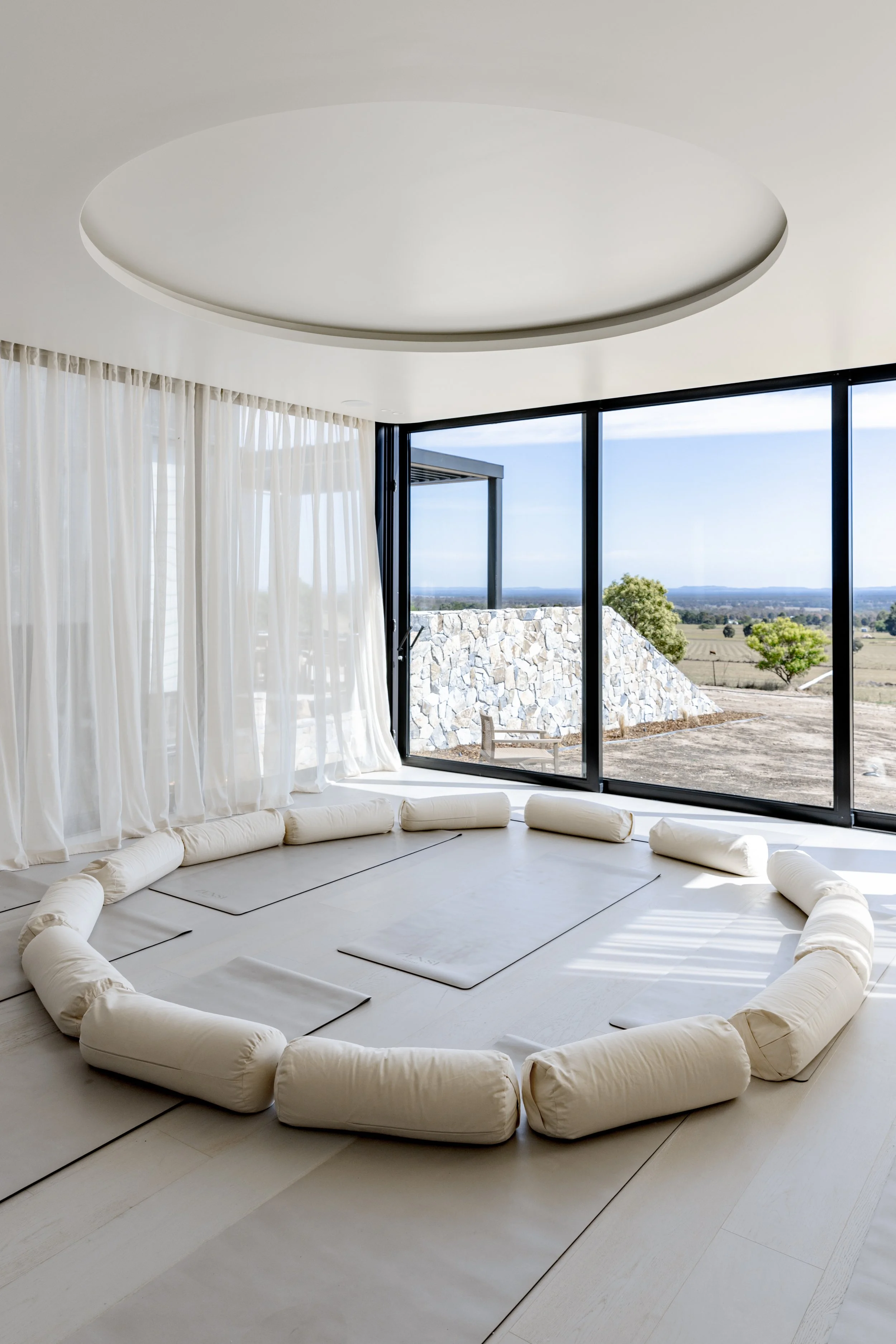 The yoga studio with a view across the country landscape.