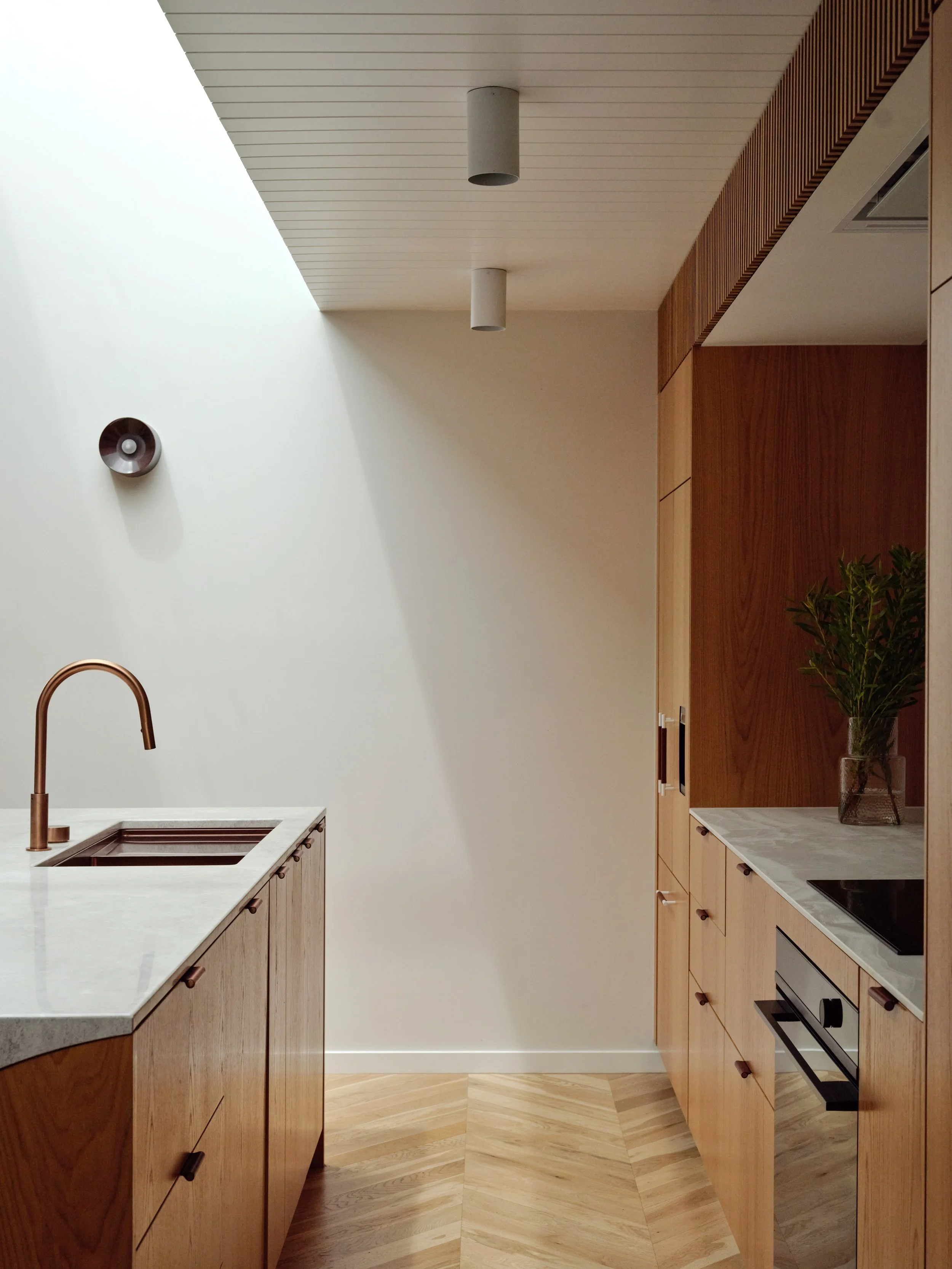 The skylight spans 4.6 x 1.2 metres allowing voluminous natural light to enter the kitchen space.