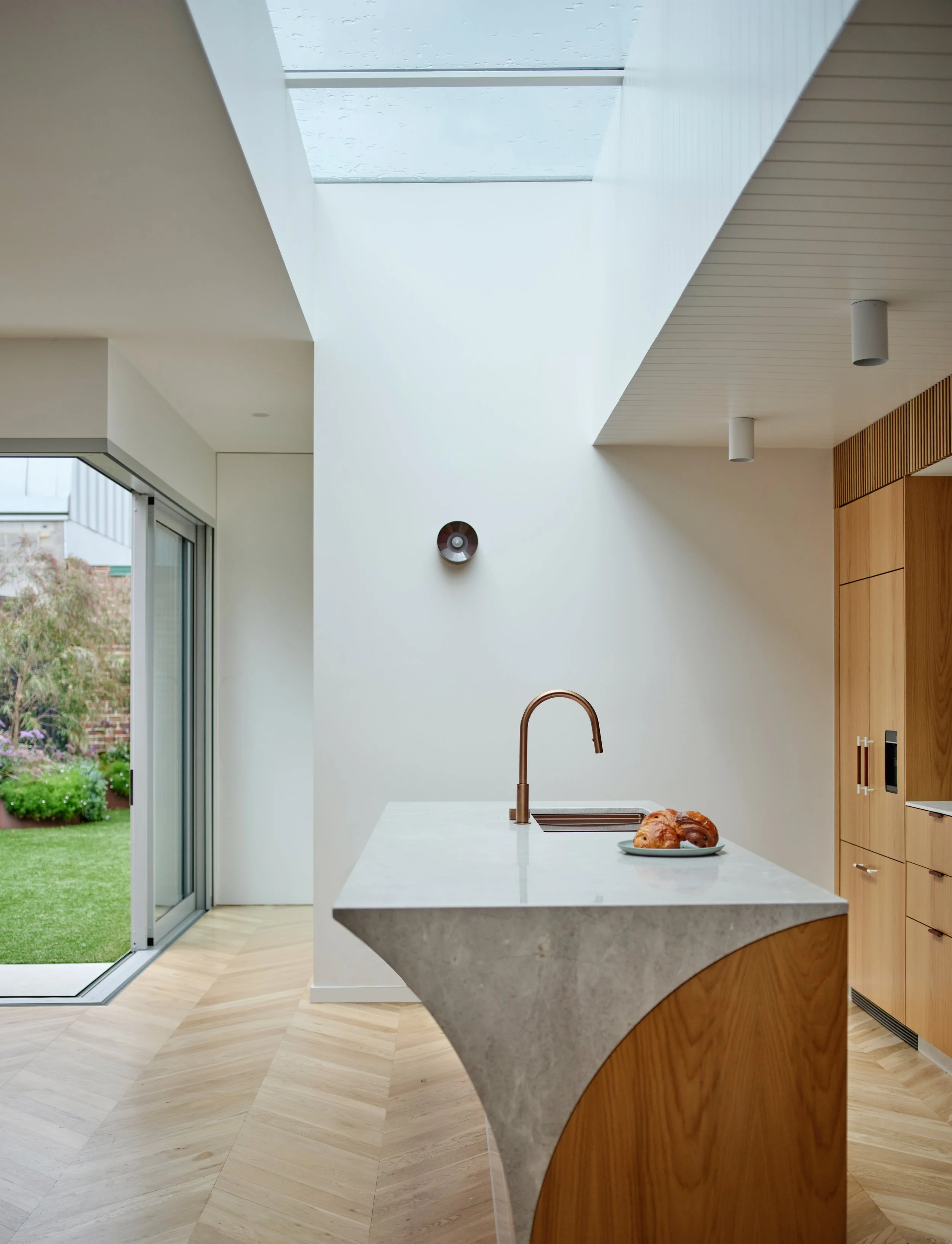 With a conscious effort to implement an assortment of unique elements in a detailed and considered manner, Zigzag House presents a home for the growing family to engage with as the years go on. The bathroom vanity includes a terrazzo benchtop with a 200mm drop-down apron that is both unique and engaging in its aesthetic and function. A 4.6m x 1.2 custom skylight sits above the marble kitchen island bench — its unique curved form making it a ‘pivotal piece’ in the home.