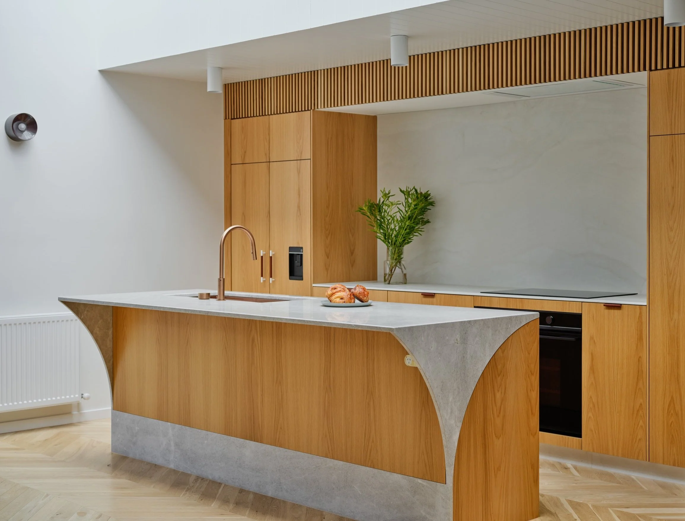 The kitchen island bench is perhaps the pivotal piece within the entire project – the marble used has been manipulated into an ethereal, elegant and curving form, which is not typically associated with a stone material.